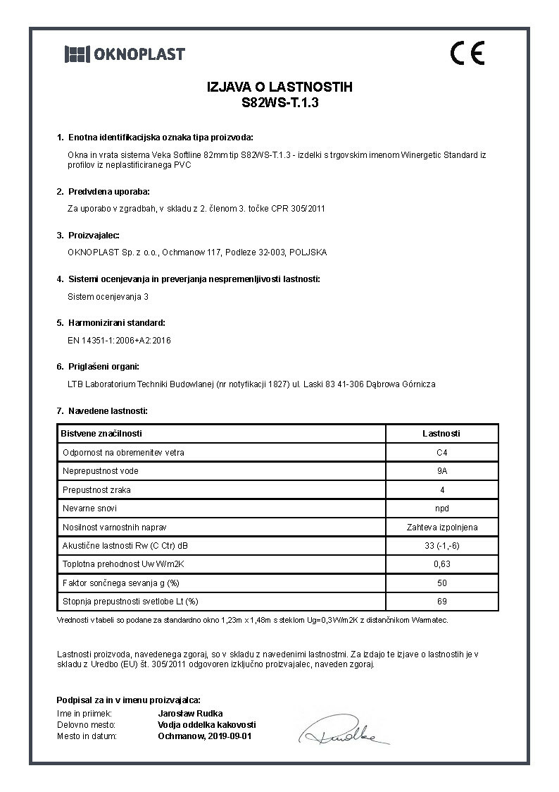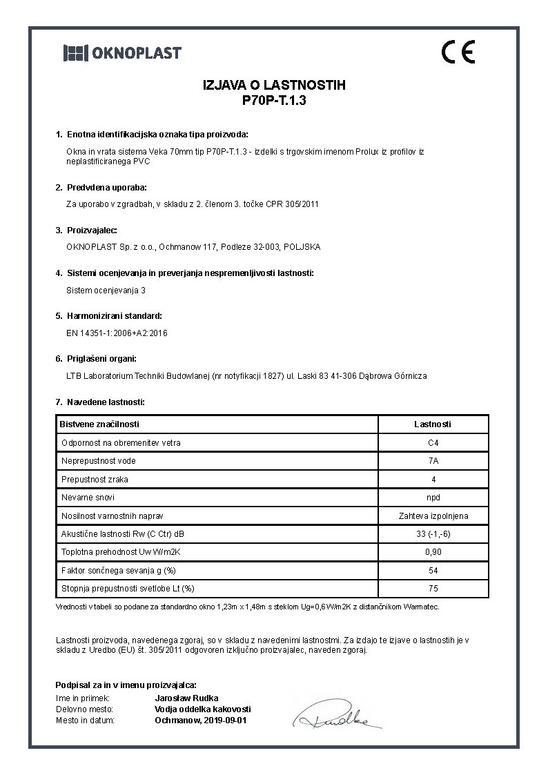 Izjava o lastnostih Prolux Aluminium